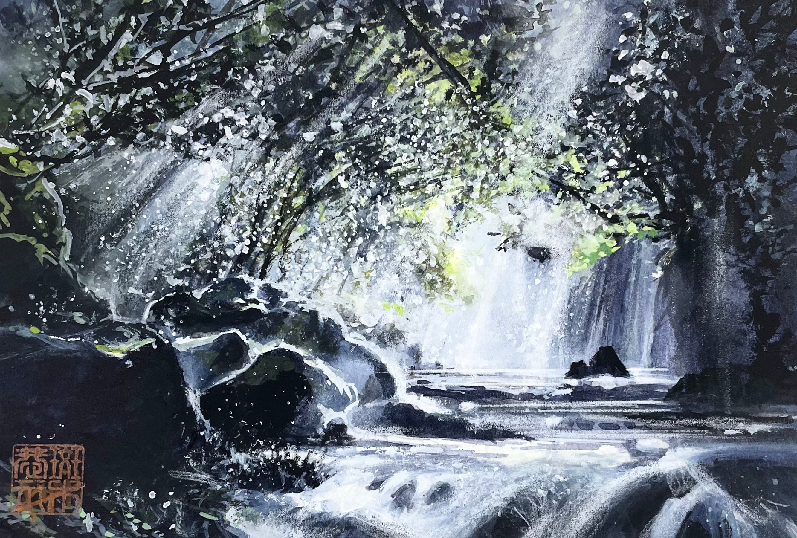 岐阜県山県市円原川は伏流水と光芒で有名な地域です。この作品は現地で描いた貴重なものです。