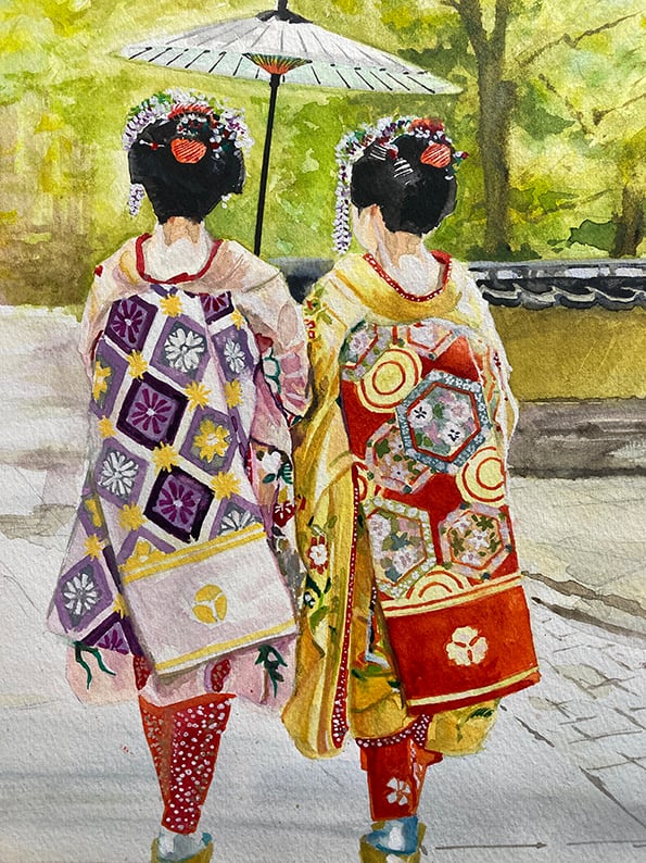 GIONシリーズは芸妓と祭の2タイプかあります。この作品は公募展で入賞したものです。若い2人の芸妓さんの綺麗な着物と日除傘が特徴。