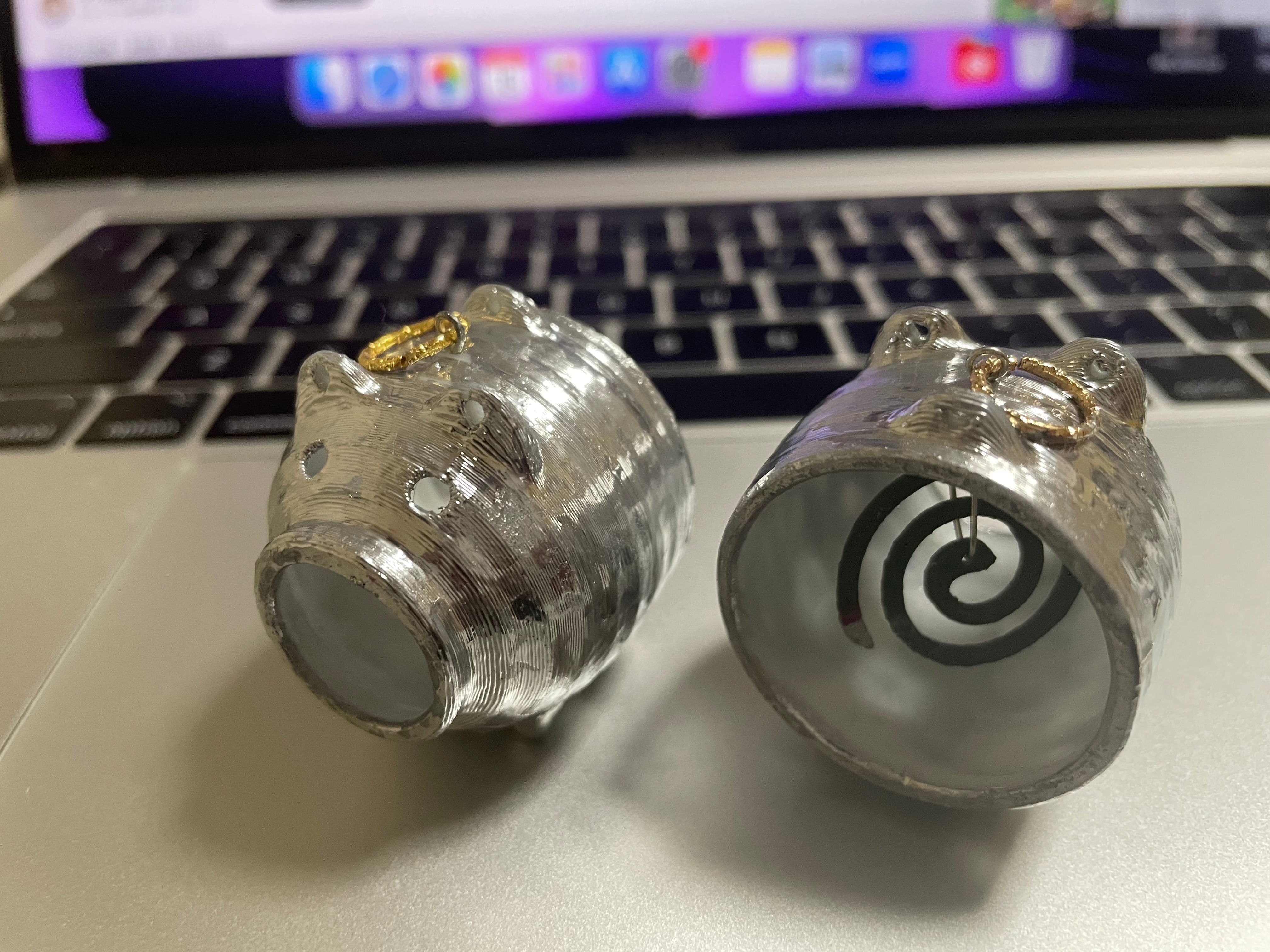 あの懐かしい蚊取りブタさんを3dで再現して、3dプリンターで出力しましたサイズは36×32mm。蚊取り線香も内臓されてChrome仕様で制作。限定2セットのみ販売します。