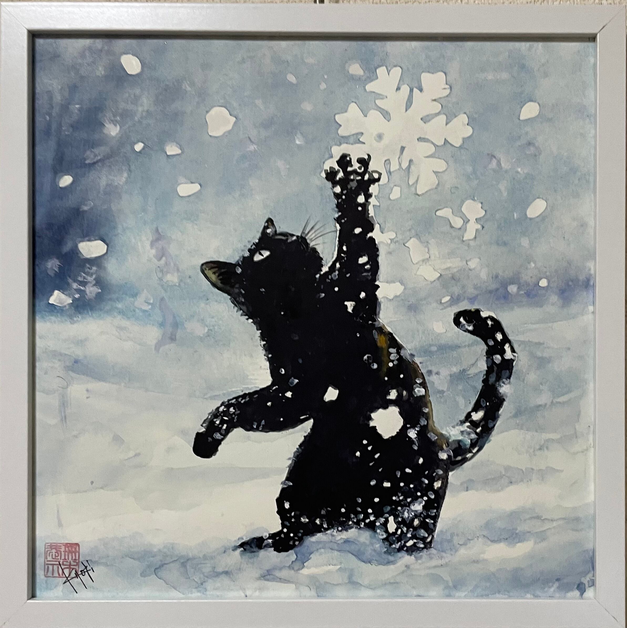 冬を掴んだ黒ちゃん 水彩原画 30×30SQ