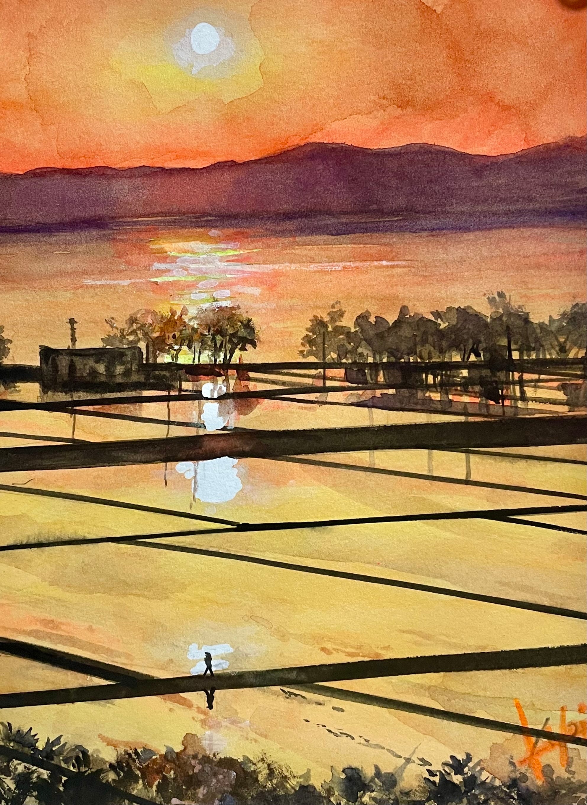 # 田園と夕陽 サムホールサイズ 水彩原画 額付