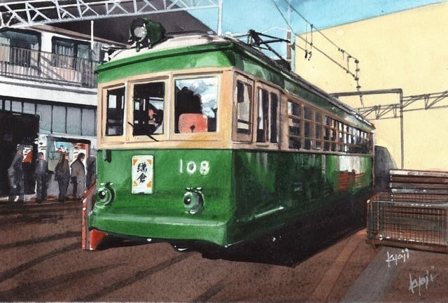復刻版江ノ電108系SM水彩原画は、今は展示されている江ノ電を手軽にお部屋に飾ることができるアイテムです。水彩画のような繊細な色使いや緻密な描写で描かれた108系SMの美しい姿は、鉄道ファンや風景画愛好家にとっても魅力的な一枚です。